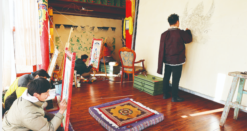 其麥(右)與學(xué)員們在傳習(xí)所內(nèi)認(rèn)真繪畫。