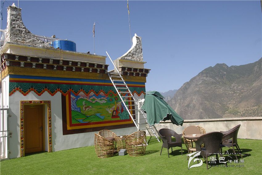 客棧的設計完全是藏式風格,很吻合楊荻給客棧起的名字:圣地映像。從大廳開始一直到客房,金碧輝煌、雕梁畫棟,每一處空間都被藏地色彩充滿。樓頂,視野開闊,左手青山,右手青天。幾個內江來的客人已在客棧呆了好幾天,他們正在燦爛陽光下商量爬山的事,他們一再和楊荻碰面,希望晚上回到客棧能吃上本地的土雞。