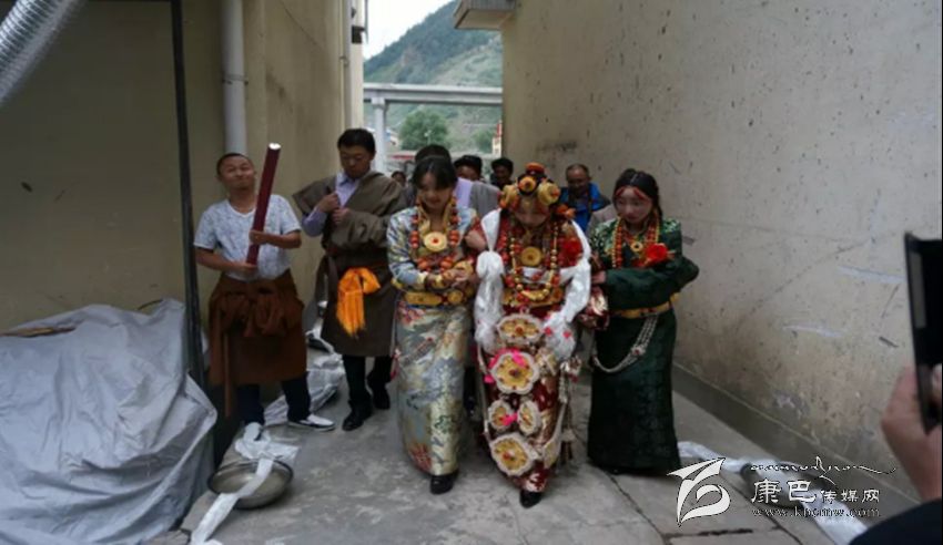 接親。除表現(xiàn)主人的熱情、好客、大方外,還要講究氣派,顯富有、高檔次、高規(guī)格。以娶親為例,舉行婚禮的當(dāng)天,男方要組織數(shù)十匹馬隊(duì)或高檔汽車(chē)接親,披金掛銀,蔟新華麗。接親的馬隊(duì)從新娘家出發(fā)后,男方要在家或路過(guò)人家必經(jīng)之地設(shè)置吉祥物,如盛滿(mǎn)一桶水或鋪一床藏毯、或隨身衣物鋪在地上,當(dāng)接送新娘的馬隊(duì)路過(guò)時(shí),接親的人要給吉祥物獻(xiàn)哈達(dá)和拋撒銀錢(qián)、紙錢(qián)和糖果等以示新娘路遇彩頭、沖喜,表示吉祥如意。到男方家后新娘被扶下馬或扶下車(chē),高僧大德頌吉祥詞后,圍繞所放佛像或吉祥八寶圖及裝滿(mǎn)水或牛奶的銅鍋?lái)樲D(zhuǎn)三圈后,踩著從大門(mén)口鋪至經(jīng)堂的藏毯進(jìn)屋,進(jìn)入客廳之前新娘只身先進(jìn)廚房,點(diǎn)燃灶里準(zhǔn)備好的柏香紅木或枝葉進(jìn)行熏煙,據(jù)藏醫(yī)考證熏香煙對(duì)身心健康有益,也可表示從即日起新娘便是男家的主婦了。