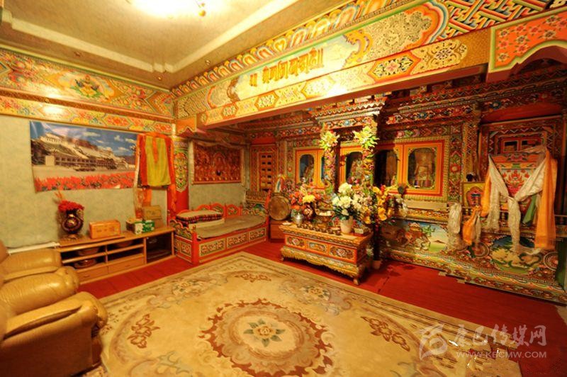 藏族居室一般分臥室、客廳、經(jīng)堂和廚房等部分。室內(nèi)陳設(shè)與裝飾如藏式建筑學(xué)者葉啟燊所言:“主次分明,重點突出。主室較為復(fù)雜而樸素,經(jīng)堂偏于華麗而清幽,其余各室均較簡單。室內(nèi)都不施粉刷,但有個別的經(jīng)堂作雕刻裝飾;土司和喇嘛上層的經(jīng)堂則會作油漆的彩畫?!辈貐^(qū)不論是農(nóng)牧民住宅還是貴族上層府邸都有供佛的設(shè)施,經(jīng)堂屬于凈地,是專門供奉神佛的,因此,一般不作他用;主室是藏族住宅中最重要的一個房間,也是功能最多的房間,其中有生活、睡眠、飲食等所需的爐灶、壁櫥、壁架、矮桌、火盆等。這些藏式家具的布置安放,早已形成一定之規(guī)。