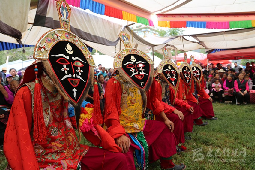 “亞堆”的第二天,藏戲正式開演。首先出場的是《江嘎冉》和《扎西協(xié)哇》,這是藏戲中居首位的兩個最古老的戲,流淌著祝福吉祥、祈禱幸福的主弦律。在大號、鎖吶、胡琴、笛子、鼓、鈸的敲擊聲中,演員們戴著面具邊跳邊唱: