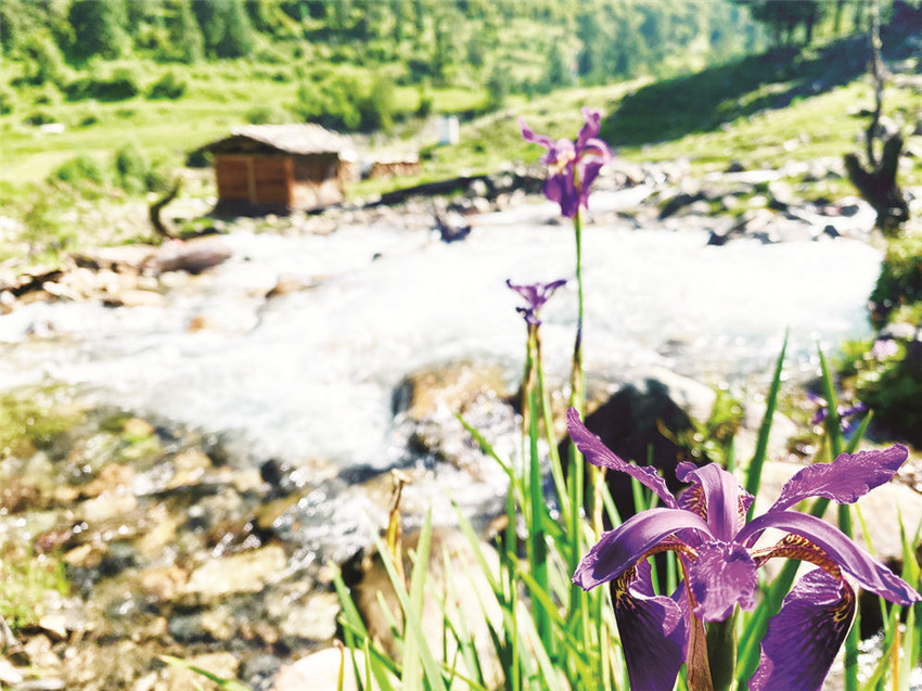 我走出木屋,朝著流動(dòng)的水聲去梳洗。三兩只藍(lán)綠色的鳥兒立在插入溪水溝里的一截木槽上低頭飲水,抬頭鳴唱,見到人影,撲棱棱幾聲飛進(jìn)了不遠(yuǎn)處的一片淺樹叢里,沒了蹤跡。一層薄薄的白霧正從牧場后方皺褶起伏的山頂漫溢下來,湮沒了黛青色的山石、綠色的小杜鵑樹叢,接著湮沒了整個(gè)牧場,眼前一片空茫,耳邊只有溪水婉轉(zhuǎn)流向遠(yuǎn)處的聲音。我蹲下身,把手伸進(jìn)溪水里,由雪水融化的沁涼很快冷冽到了骨頭里,再往深處,觸摸到一個(gè)個(gè)光滑的圓石。浸泡久了,溪水開始變得柔軟溫暖起來,掬一捧洗臉,那清爽仿佛能使我一眼看開眼前的云霧,看清那些停立于山頂石礫之上的灰色獐子和樹叢深處悄然綻開的紫色貝母花,花瓣上星星點(diǎn)點(diǎn)的白是它與生俱來的喜色。
