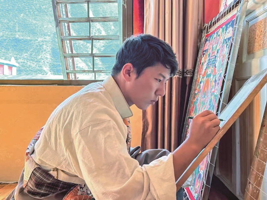 難以想象,眼前這名陽(yáng)光帥氣的95后藏族大男孩已是從事唐卡繪畫18年的“老畫師”。