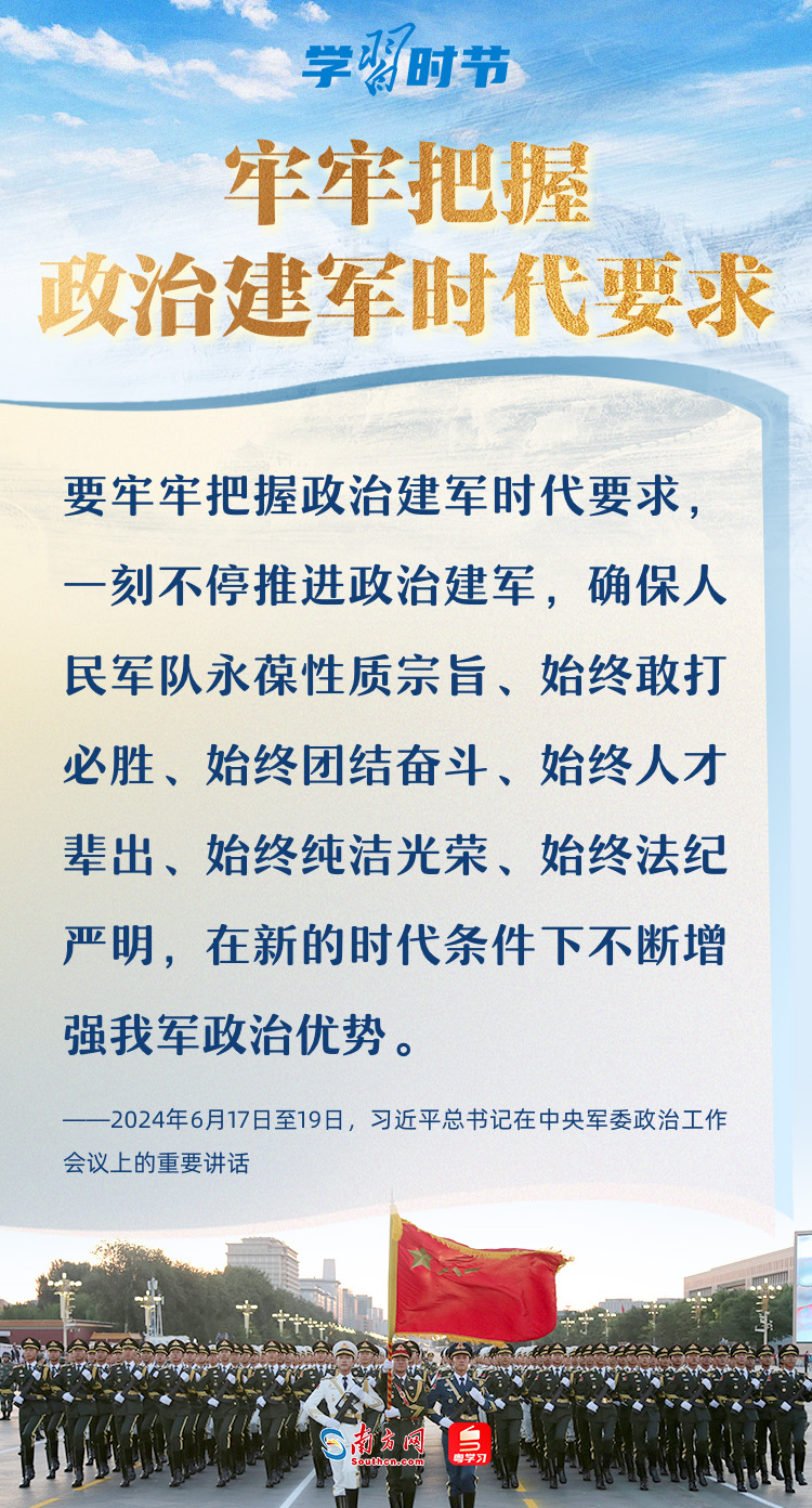 2024年6月,中央軍委政治工作會(huì)議在陜西延安召開(kāi)。習(xí)主席強(qiáng)調(diào),要堅(jiān)持黨對(duì)軍隊(duì)絕對(duì)領(lǐng)導(dǎo),貫徹落實(shí)新時(shí)代政治建軍方略,牢牢把握政治建軍時(shí)代要求,聚焦打好實(shí)現(xiàn)建軍一百年奮斗目標(biāo)攻堅(jiān)戰(zhàn),發(fā)揚(yáng)徹底的自我革命精神,持續(xù)深化政治整訓(xùn),鍛造政治堅(jiān)定、能力過(guò)硬的堅(jiān)強(qiáng)黨組織,鍛造忠誠(chéng)干凈擔(dān)當(dāng)、堪當(dāng)強(qiáng)軍重任的高素質(zhì)干部隊(duì)伍,為強(qiáng)軍事業(yè)提供堅(jiān)強(qiáng)政治保證。