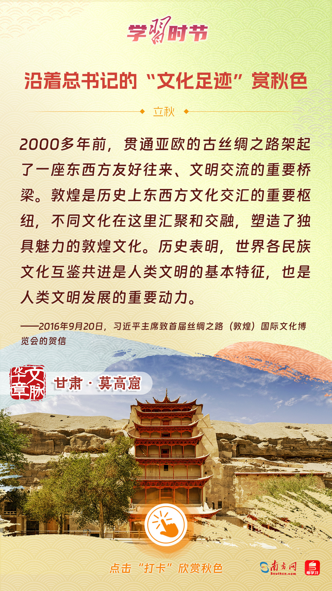 立秋之際,讓我們一起跟隨習(xí)近平總書記的足跡,學(xué)習(xí)習(xí)近平總書記關(guān)于文化建設(shè)的重要論述,感受全國各地文化地標(biāo)古跡的秋意,汲取文化自信的強(qiáng)大力量。