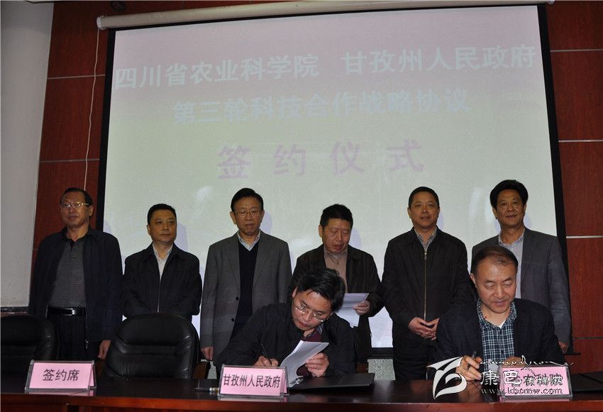 省農(nóng)科院院長(zhǎng)李躍建(右)與甘孜州政府副州長(zhǎng)杜德清(左)簽訂“院州”第三輪科技合作戰(zhàn)略協(xié)議。