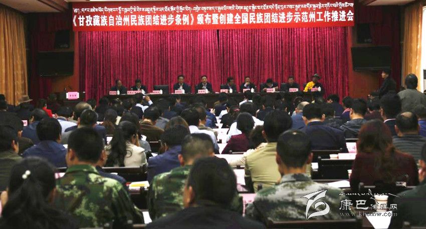 會議對全州第三批民族團結進步示范單位授牌,并向部分縣(市)州級部門贈送《甘孜藏族自治州民族團結進步條例》。