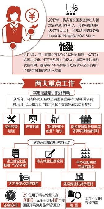 2017年,四川要“確保實(shí)現(xiàn)16個貧困縣摘帽、3700個貧困村退出、105萬貧困人口脫貧。加強(qiáng)產(chǎn)業(yè)扶持和就業(yè)幫助,確保每個有條件的計劃脫貧戶至少發(fā)展1個增收項(xiàng)目或?qū)崿F(xiàn)1人就業(yè)”的目標(biāo)。