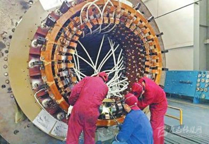 2月22日,在東方電機(jī)發(fā)電機(jī)分廠,工人們正對中煤五彩灣4號機(jī)定子進(jìn)行高工位電路焊接。 東方電氣集團(tuán)東方電機(jī)有限公司供圖