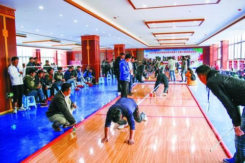今年,我州將由115名運(yùn)動員、教練員等組成11支運(yùn)動隊(duì),參與賽事設(shè)置的8個競賽項(xiàng)目和2個表演項(xiàng)目,其中有兩支隊(duì)伍將參與綜合類表演項(xiàng)目比賽。我州總參賽人數(shù)相比上一屆略有減少。我州參加綜合類表演項(xiàng)目比賽的節(jié)目是《瑪亞切通》和《炯動》。《瑪亞切通》譯為孔雀吃水,主要體現(xiàn)力量和平衡的動作;《炯動》取材于藏民族農(nóng)村修建房屋時的勞動場面,以青年男女在勞動過程中載歌載舞對歌或比拼勞動成果、質(zhì)量、進(jìn)度為內(nèi)容,主要比拼身體的力量和靈活度。我州參加競技類表演項(xiàng)目比賽的節(jié)目是《嘎久》。《嘎久》意為翻閱馬鞍或吉祥翻越,是藏族人民節(jié)日聚會時的一種競技體育活動,主要比拼靈活性、趣味性和技巧性。