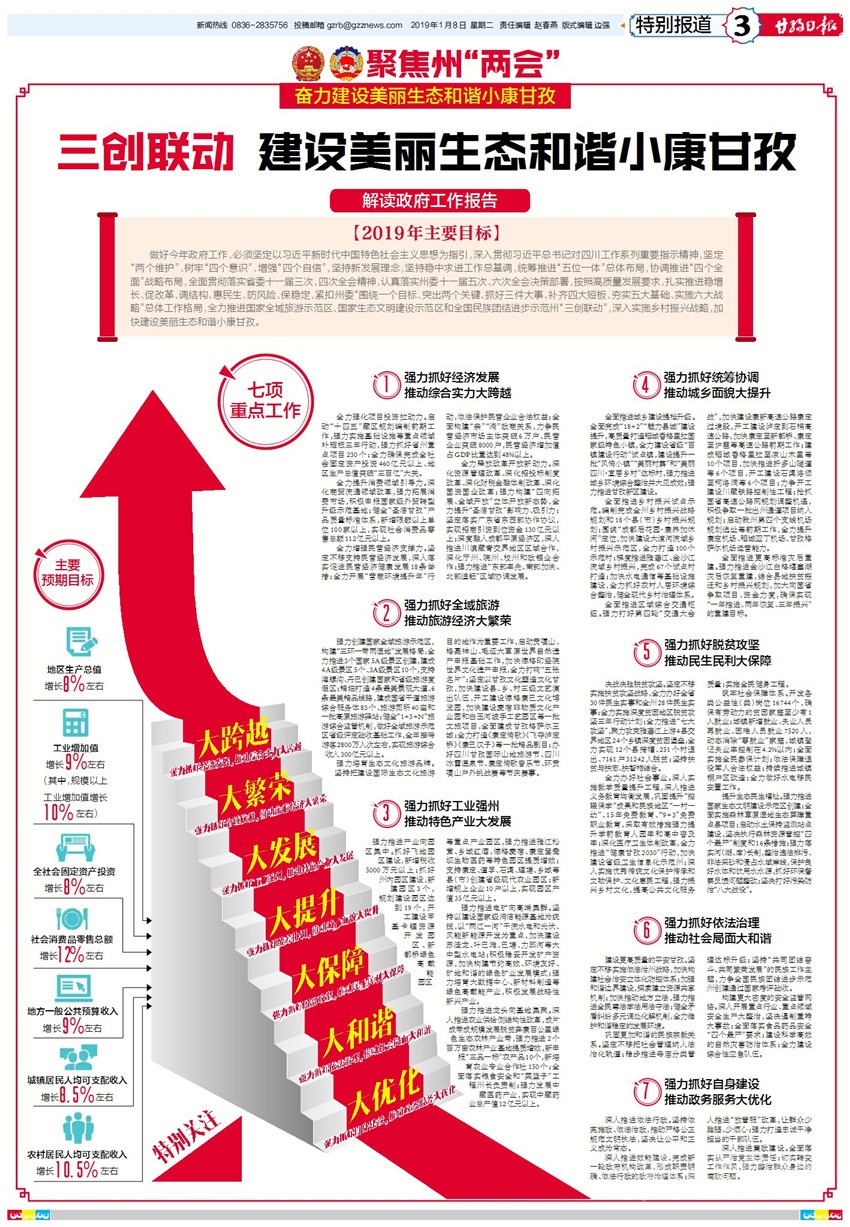 肖友才指出,做好今年政府工作,必須堅(jiān)定以習(xí)近平新時(shí)代中國(guó)特色社會(huì)主義思想為指引, 深入貫徹習(xí)近平總書(shū)記對(duì)四川工作系列重要指示精神,堅(jiān)定“兩個(gè)維護(hù)”、樹(shù)牢“四個(gè)意識(shí)”、增強(qiáng)“四個(gè)自信”,堅(jiān)持新發(fā)展理念,堅(jiān)持穩(wěn)中求進(jìn)工作總基調(diào),統(tǒng)籌推進(jìn)“五位一體”總體布局,協(xié)調(diào)推進(jìn)“四個(gè)全面”戰(zhàn)略布局,全面貫徹落實(shí)省委十一屆三次、四次全會(huì)精神,認(rèn)真落實(shí)州委十一屆五次、六次全會(huì)決策部署,按照高質(zhì)量發(fā)展要求,扎實(shí)推進(jìn)穩(wěn)增長(zhǎng)、促改革、調(diào)結(jié)構(gòu)、惠民生、防風(fēng)險(xiǎn)、保穩(wěn)定,緊扣州委“圍繞一個(gè)目標(biāo)、突出兩個(gè)關(guān)鍵、抓好三件大事、補(bǔ)齊四大短板、夯實(shí)五大基礎(chǔ)、實(shí)施六大戰(zhàn)略”總體工作格局,全力推進(jìn)國(guó)家全域旅游示范區(qū)、國(guó)家生態(tài)文明建設(shè)示范區(qū)和全國(guó)民族團(tuán)結(jié)進(jìn)步示范州“三創(chuàng)聯(lián)動(dòng)”,深入實(shí)施鄉(xiāng)村振興戰(zhàn)略,加快建設(shè)美麗生態(tài)和諧小康甘孜。今年全州經(jīng)濟(jì)社會(huì)發(fā)展主要預(yù)期目標(biāo)是:地區(qū)生產(chǎn)總值增長(zhǎng)8%左右;工業(yè)增加值增長(zhǎng)9%左右(其中,規(guī)模以上工業(yè)增加值增長(zhǎng)10%左右);全社會(huì)固定資產(chǎn)投資增長(zhǎng)8%左右;社會(huì)消費(fèi)品零售總額增長(zhǎng)12%左右;地方一般公共預(yù)算收入增長(zhǎng)9%左右;城鎮(zhèn)居民人均可支配收入增長(zhǎng)8.5%左右;農(nóng)村居民人均可支配收入增長(zhǎng)10.5%左右。肖友才表示,要實(shí)現(xiàn)上述目標(biāo),我們必須以一張藍(lán)圖繪到底的戰(zhàn)略定力、重整行裝再出發(fā)的奮斗姿態(tài)、與時(shí)俱進(jìn)譜新篇的擔(dān)當(dāng)精神,勇于挑最重的擔(dān)子、善于啃最硬的骨頭、敢于接最燙的山芋,奮力書(shū)寫(xiě)出無(wú)愧于時(shí)代、無(wú)愧于人民、無(wú)愧于歷史的甘孜答卷。