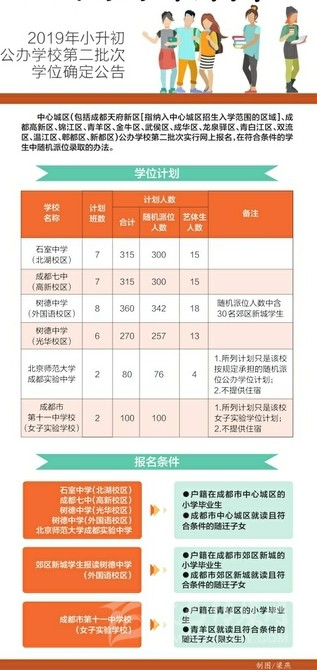 6月17日,記者從成都市教育局獲悉,根據(jù)《成都市教育局關于2019年小學畢業(yè)生初中入學工作的通知》(成教函〔2019〕35號)規(guī)定,中心城區(qū)(包括成都天府新區(qū)[指納入中心城區(qū)招生入學范圍的區(qū)域]、成都高新區(qū)、錦江區(qū)、青羊區(qū)、金牛區(qū)、武侯區(qū)、成華區(qū)、龍泉驛區(qū)、青白江區(qū)、雙流區(qū)、溫江區(qū)、郫都區(qū)、新都區(qū))公辦學校第二批次(詳見學位計劃表)實行網(wǎng)上報名、在符合條件的學生中隨機派位錄取的辦法。網(wǎng)上申報時間為6月22日10:00至25日17:00;7月2日16:00,成都市招考辦將在服務平臺上載入派位結果,學校公布錄取學生名單。