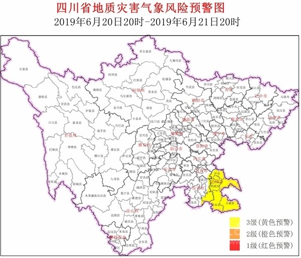 四川在線消息(記者 寇敏芳)6月20日,省自然資源廳發(fā)布全省地災(zāi)氣象風(fēng)險(xiǎn)預(yù)警。結(jié)合四川省氣象臺天氣預(yù)報(bào)情況,6月20日20時(shí)~6月21日20時(shí),全省地質(zhì)災(zāi)害氣象風(fēng)險(xiǎn)預(yù)警等級為3級(黃色預(yù)警,注意級),具體結(jié)果如下: