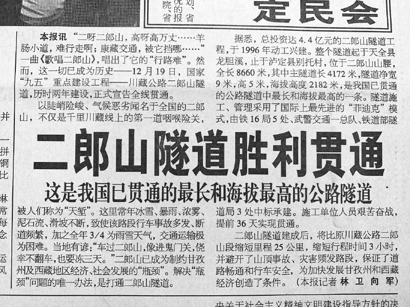 二郎山老路交通瓶頸,影響到甘孜州及西藏地區(qū)經(jīng)濟社會發(fā)展。1996年,二郎山隧道開建,歷時2年,于1998年底貫通。“二郎山隧道當時是全國最長、海拔最高、地質(zhì)最復雜的公路隧道,建設(shè)很不容易?!绷中l(wèi)回憶,當年采訪建設(shè)二郎山隧道的鐵道部隧道局三處和武警交通一總隊時,曾聽聞隧道開挖中遇到的各種危險,一名現(xiàn)場指揮長就曾被卷入洪水,所幸后來死里逃生。