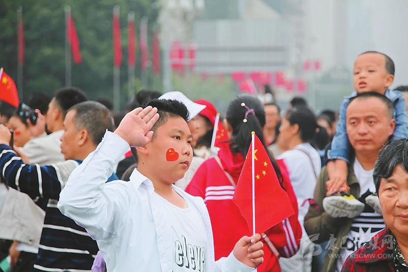 在內(nèi)江市大洲廣場,許多市民臉上貼著國旗,歡欣地?fù)]動(dòng)著手中的五星紅旗。當(dāng)慷慨激昂的國歌響起,全場人員唱起國歌,對偉大祖國致以無限敬意和深深祝福。