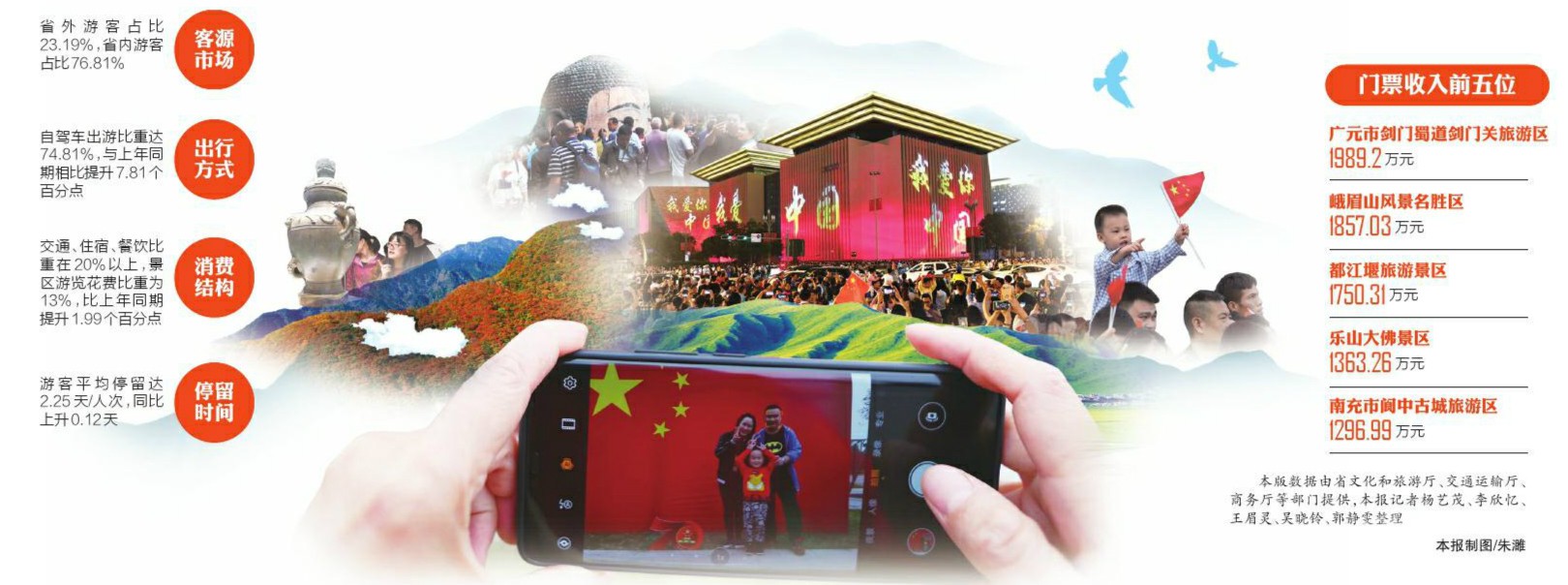 假日期間,全省文化旅游市場運行總體平穩(wěn)有序,據(jù)國慶旅游接待抽樣調(diào)查結(jié)果顯示,從客源市場看,省外游客占比23.19%,省外游客占比較去年增長0.7個百分點,省內(nèi)游客占比76.81%。從出行方式看,自駕車出游比重達74.81%,與上年同期相比提升7.81個百分點。從消費結(jié)構(gòu)來看,交通、住宿、餐飲比重在20%以上,景區(qū)游覽花費比重為13%,比上年同期提升1.99個百分點。從游客停留時間來看,游客平均停留達2.25天/人次,同比上升0.12天。從游客人均天花費來看,省外在川過夜游客人均消費356.24元/天,同比消費上升43.7元。全省納入統(tǒng)計的74個4A級以上景區(qū),傳統(tǒng)自然觀光型景區(qū)游客人次及收入呈下降趨勢,開放式文博類景區(qū)、度假旅游區(qū)游客人次明顯增加,并帶動收入增加。接待游客人次增幅前五位的是:雅安市蒙頂山旅游區(qū)(1.94萬人次,同比增長234.68%)、螺髻山旅游景區(qū)(3.85萬人次,同比增長229.49%)、甘孜州康定情歌(木格措)風(fēng)景區(qū)(5.55萬人次,同比增長162.93%)、黃龍風(fēng)景名勝區(qū)(4.59萬人次,同比增長99.01%)、廣元皇澤寺(3.061萬人次,同比增長55.33%)。門票收入前五位是:廣元市劍門蜀道劍門關(guān)旅游區(qū)(1989.2萬元)、峨眉山風(fēng)景名勝區(qū)(1857.03萬元)、都江堰旅游景區(qū)(1750.31萬元)、樂山大佛景區(qū)(1363.26萬元)、南充市閬中古城旅游區(qū)(1296.99萬元)。