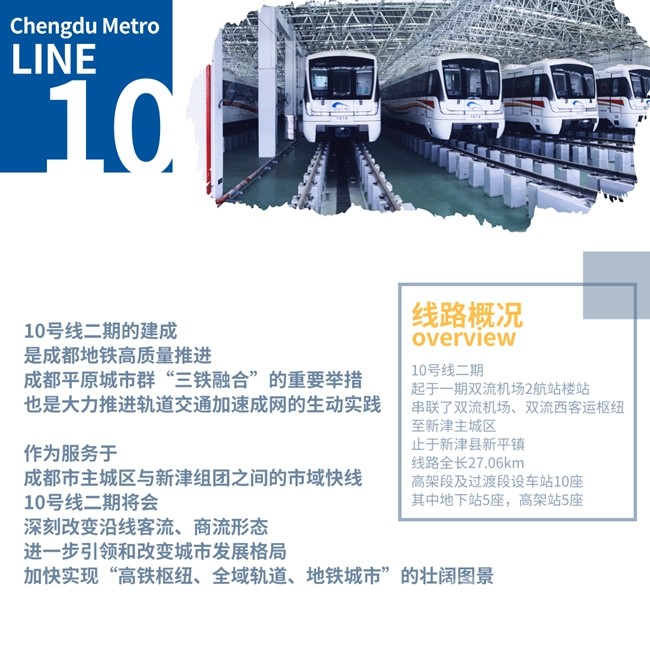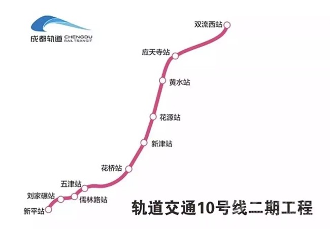 10號(hào)線二期起于一期雙流機(jī)場2航站樓站,串聯(lián)了雙流機(jī)場、雙流西客運(yùn)樞紐至新津主城區(qū),止于新津縣新平鎮(zhèn),線路全長27.06km,高架段及過渡段設(shè)車站10座,其中地下站5座,高架站5座。