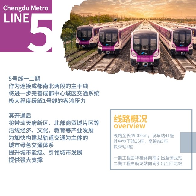 其中,5號(hào)線一二期作為連接成都南北兩段的主干線,將進(jìn)一步完善成都中心城區(qū)交通系統(tǒng),極大程度緩解1號(hào)線的客流壓力,其開通后將帶動(dòng)天府新區(qū)、北部商貿(mào)城片區(qū)等沿線經(jīng)濟(jì)、文化、教育等產(chǎn)業(yè)發(fā)展,為加快構(gòu)建以軌道交通為主體的城市綠色交通體系,提升城市能級(jí)、引領(lǐng)城市發(fā)展提供強(qiáng)大支撐。