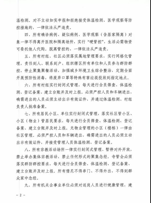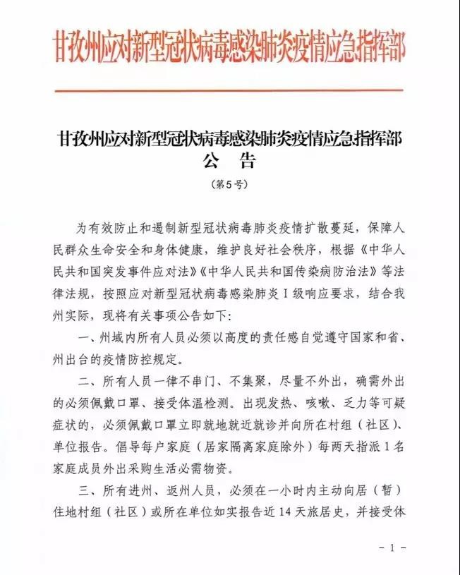 一、州域內(nèi)所有人員必須以高度的責(zé)任感自覺遵守國家和省、州出臺的疫情防控規(guī)定。二、所有人員一律不串門、不集聚,盡量不外出,確需外出的必須佩戴口罩、接受體溫檢測。出現(xiàn)發(fā)熱、咳嗽、乏力等可疑癥狀的,必須佩戴口罩立即就地就近就診并向所在村組(社區(qū))、單位報(bào)告。倡導(dǎo)每戶家庭(居家隔離家庭除外)每兩天指派1名家庭成員外出采購生活必需物資。三、所有進(jìn)州、返州人員,必須在一小時(shí)內(nèi)主動向居(暫)住地村組(社區(qū))或所在單位如實(shí)報(bào)告近14天旅居史,并接受體溫檢測。對不主動如實(shí)申報(bào)和拒絕接受體溫檢測、醫(yī)學(xué)觀察等防控措施的,一律依法從嚴(yán)追責(zé)。四、所有確診病例、疑似病例、醫(yī)學(xué)觀察(含居家隔離)對象一律不得離開醫(yī)院和隔離場所,實(shí)行“硬管控”,生活必需物資可委托他人代購。脫離管控的,一律依法從嚴(yán)追責(zé)。五、所有村組、社區(qū)必須落實(shí)屬地管理要求,實(shí)行網(wǎng)格化管理,責(zé)任到人、聯(lián)系到戶,組織轄區(qū)所有單位和人員參與群防群控,停止聚集聚餐活動,加強(qiáng)城鄉(xiāng)環(huán)境衛(wèi)生綜合整治,定期全面開展預(yù)防性消毒,將廢棄口罩等特殊有害垃圾投放到指定地點(diǎn)。六、所有村組實(shí)行封閉式管理,每天進(jìn)行全員篩查、體溫檢測、登記備案、建立臺賬并及時(shí)上報(bào)。必須嚴(yán)控人員和車輛進(jìn)出,確需進(jìn)出的人員必須主動出示有效證件,并通過體溫檢測、村組負(fù)責(zé)人批準(zhǔn)備案。七、所有居民小區(qū)、單位實(shí)行封閉式管理,落實(shí)社區(qū)管小區(qū)、小區(qū)(物業(yè))管居民要求,每天進(jìn)行全員篩查、體溫檢測、登記備案、建立臺賬并及時(shí)上報(bào)。無物業(yè)管理的小區(qū)(樓棟)一律由社區(qū)管理。必須嚴(yán)控人員和車輛進(jìn)出,確需進(jìn)出的人員必須主動出示有效證件,并接受管理人員體溫檢測、登記備案。八、所有宗教活動場所一律實(shí)行封閉式管理、暫停對外開放,禁止舉辦集體宗教活動,禁止任何形式的聚集念經(jīng)。寺管會必須落實(shí)群防群控要求,每天進(jìn)行全員篩查、體溫檢測、登記備案、建立臺賬并及時(shí)上報(bào)。所有僧尼不得串門、不得外出,不得到群眾家中念經(jīng)。九、所有機(jī)關(guān)企事業(yè)單位必須對返崗人員進(jìn)行健康管理,建立管理臺賬,并向所在社區(qū)(村組)報(bào)備,對確認(rèn)無可疑癥狀的準(zhǔn)予返崗工作。單位食堂必須規(guī)范管理,實(shí)行分散就餐。十、非居民生活必需的公共場所一律關(guān)閉,經(jīng)批準(zhǔn)營業(yè)的公共場所中央空調(diào)一律關(guān)停。商場、超市、賓館、飯店、農(nóng)貿(mào)市場、公共客運(yùn)、個(gè)體商戶等市場經(jīng)營主體必須嚴(yán)格落實(shí)疫情防控措施,每天開展預(yù)防性消毒工作,從業(yè)和進(jìn)入人員一律佩戴口罩、檢測體溫、備案登記。藥店、診所、村衛(wèi)生室出售退燒、咳嗽類藥品必須實(shí)名制登記,并每日上報(bào)轄區(qū)疾控部門,對近14天有重點(diǎn)疫區(qū)旅居史的立即上報(bào)??爝f、外賣實(shí)行無接觸配送。十一、車站、機(jī)場和交通檢疫站點(diǎn)實(shí)行進(jìn)出人員全覆蓋體溫檢測和登記備案制度,對體溫異常人員立即采取就地就近隔離觀察。對拒絕配合的,公安機(jī)關(guān)依法協(xié)助強(qiáng)制執(zhí)行;對妨害執(zhí)行公務(wù)的,公安機(jī)關(guān)依法從嚴(yán)從重處理。十二、廣大黨員、干部、各級人大代表、政協(xié)委員要發(fā)揮帶頭作用,嚴(yán)格管好家人和親屬,積極主動參與疫情防控工作,帶動街坊鄰居自覺遵守相關(guān)規(guī)定。 本公告自發(fā)布之日起實(shí)施,終止日期另行公告。 甘孜州應(yīng)對新型冠狀病毒感染肺炎疫情應(yīng)急指揮部
