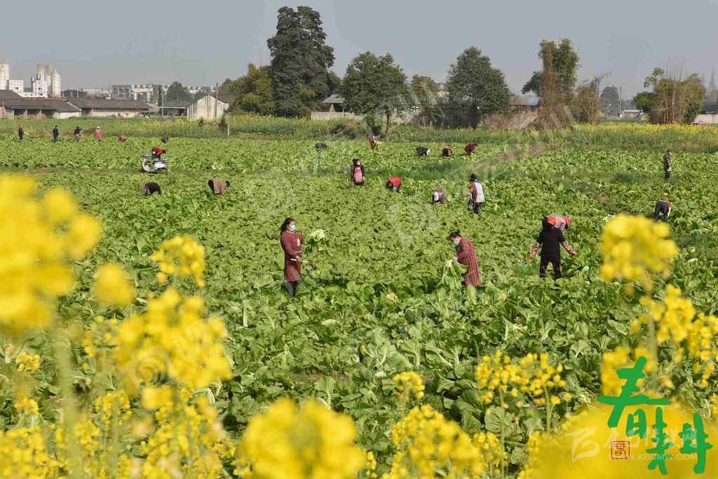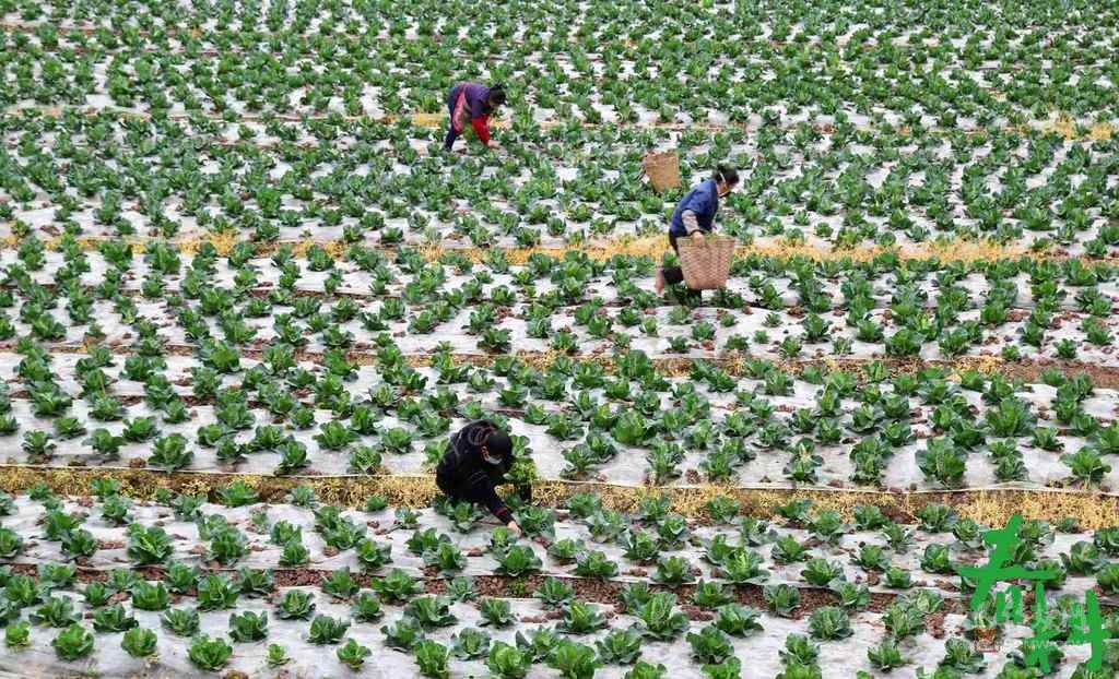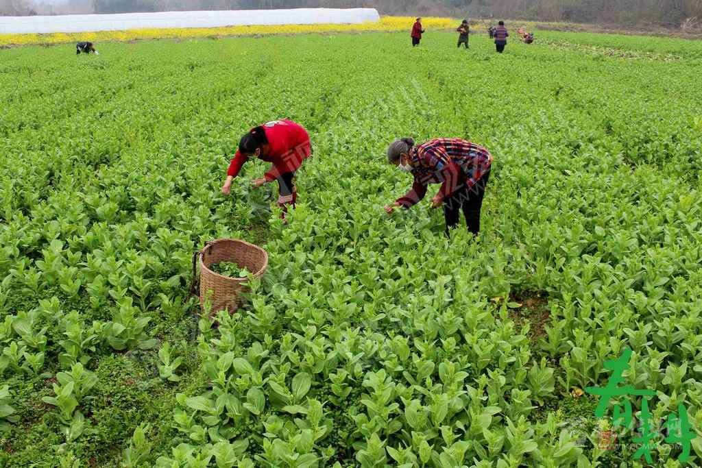 綿竹市紫巖街道雙坪村5組,當?shù)剞r(nóng)戶在天佑家庭農(nóng)場收割青菜,以便騰地后用于水稻生產(chǎn)。