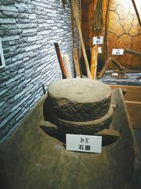三河村村史館內(nèi)陳列的吊鍋、石磨和彝族漆器等生活用具。