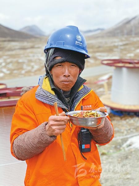 “5分鐘不吃完,飯菜就全涼了?!币晃皇┕と藛T說(shuō),在海拔4000米以上的施工一線(xiàn),他們已經(jīng)習(xí)慣了這樣的吃飯速度。