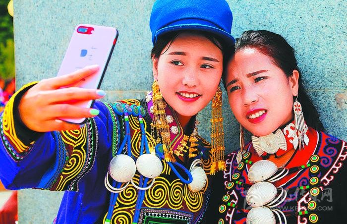 ▲在布拖縣城舉辦的彝族火把節(jié)上,兩位彝族女子用手機(jī)自拍留念。(攝于2018年7月)