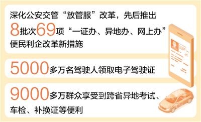 今年12月2日是第十個“全國交通安全日”,最新數(shù)據(jù)顯示,我國機(jī)動車和駕駛?cè)藬?shù)量持續(xù)增長,目前機(jī)動車保有量已達(dá)3.93億輛,駕駛?cè)诉_(dá)4.79億人。面對道路交通大發(fā)展的新形勢、人民群眾日益增長的新需求,公安部不斷深化公安交管“放管服”改革,先后推出8批次69項“一證辦、異地辦、網(wǎng)上辦”便民利企改革新措施,為群眾和企業(yè)減少辦事成本800多億元。
