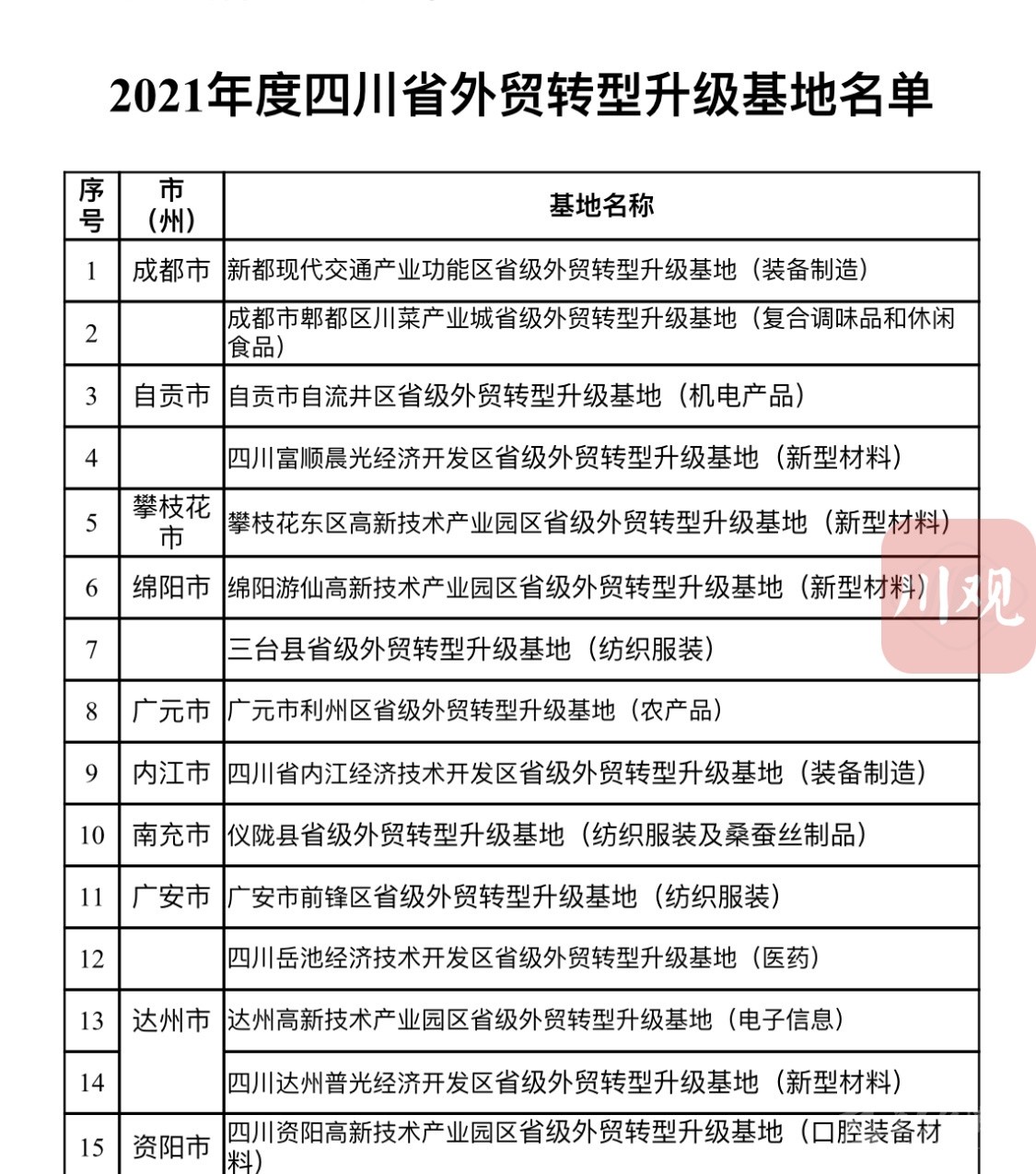 12月9日,記者從省商務(wù)廳獲悉,四川第二批省級(jí)外貿(mào)轉(zhuǎn)型升級(jí)基地出爐。至此,四川共有國(guó)家級(jí)外貿(mào)轉(zhuǎn)型升級(jí)基地20家、省級(jí)外貿(mào)轉(zhuǎn)型升級(jí)基地30家,國(guó)家級(jí)、省級(jí)外貿(mào)轉(zhuǎn)型升級(jí)基地分布全省16個(gè)市(州),覆蓋全省“五大片區(qū)”。