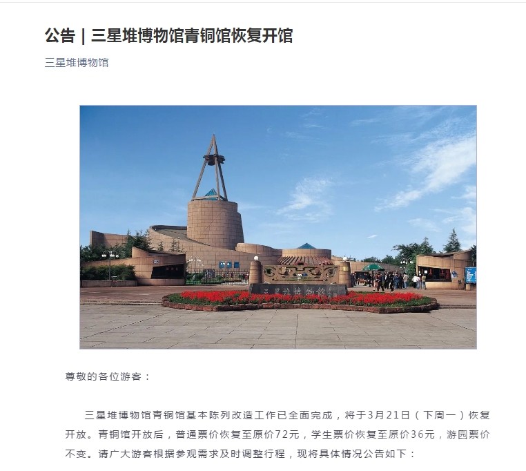 三星堆博物館青銅館基本陳列改造工作已全面完成,將于3月21日(下周一)恢復開放。青銅館開放后,普通票價恢復至原價72元,學生票價恢復至原價36元,游園票價不變。請廣大游客根據參觀需求及時調整行程,現將具體情況公告如下: