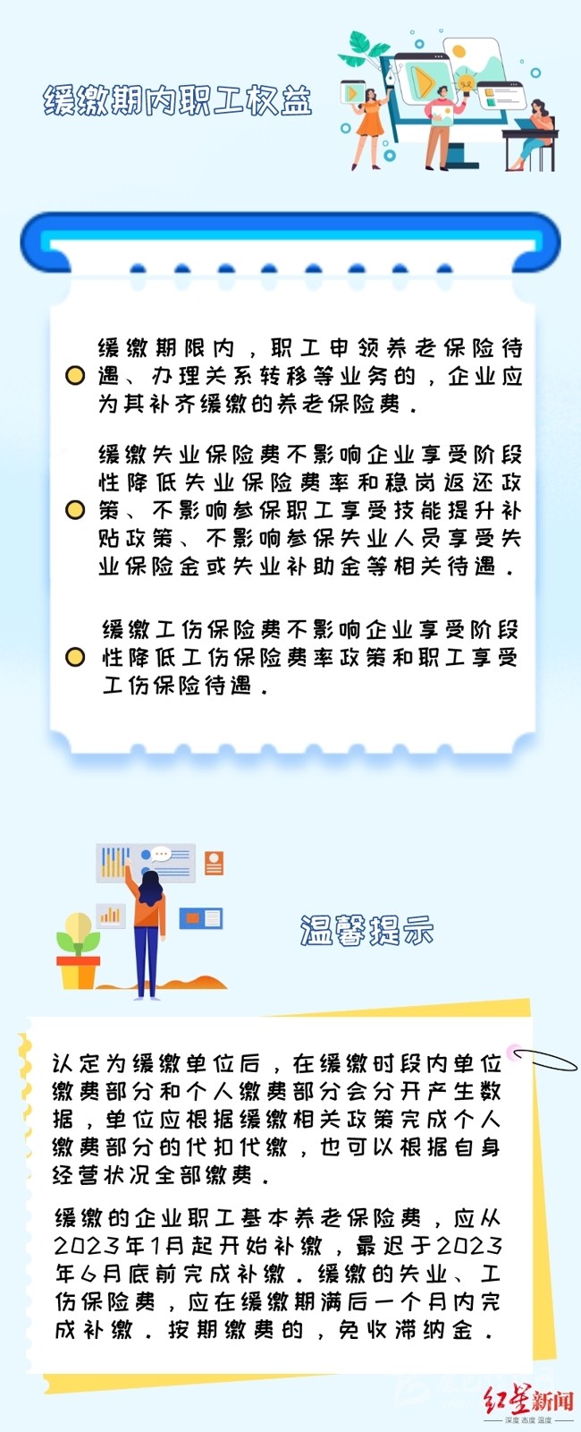 緩繳期限內(nèi),職工申領(lǐng)養(yǎng)老保險待遇、辦理關(guān)系轉(zhuǎn)移等業(yè)務(wù)的,企業(yè)應(yīng)為其補(bǔ)齊緩繳的養(yǎng)老保險費(fèi)。緩繳失業(yè)保險費(fèi)不影響企業(yè)享受階段性降低失業(yè)保險費(fèi)率和穩(wěn)崗返還政策、不影響參保職工享受技能提升補(bǔ)貼政策、不影響參保失業(yè)人員享受失業(yè)保險金或失業(yè)補(bǔ)助金等相關(guān)待遇。緩繳工傷保險費(fèi)不影響企業(yè)享受階段性降低工傷保險費(fèi)率政策和職工享受工傷保險待遇,要切實(shí)維護(hù)好職工權(quán)益。