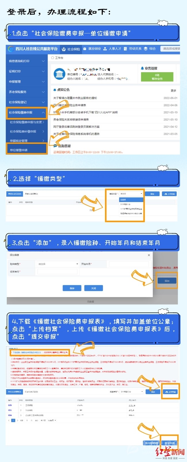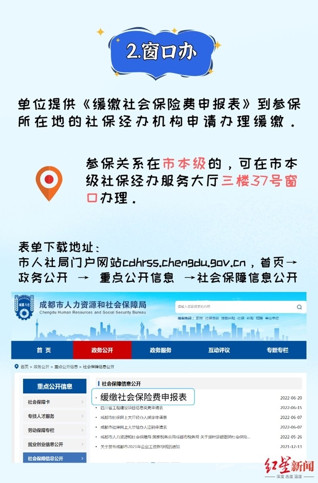 7月26日,紅星新聞記者從成都市人社局獲悉,今年6月,四川省人社廳、省發(fā)改委、省財政廳、省稅務(wù)局聯(lián)合出臺的《關(guān)于擴(kuò)大階段性緩繳社會保險費(fèi)政策實(shí)施范圍等問題的通知》,明確了延長階段性減免企業(yè)基本養(yǎng)老保險、失業(yè)保險、工傷保險單位繳費(fèi)政策實(shí)施期限,同時將階段性緩繳社會保險費(fèi)政策擴(kuò)圍至22個行業(yè)。