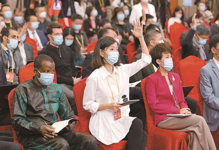 記者在分會場舉手提問。 新華社 發(fā)