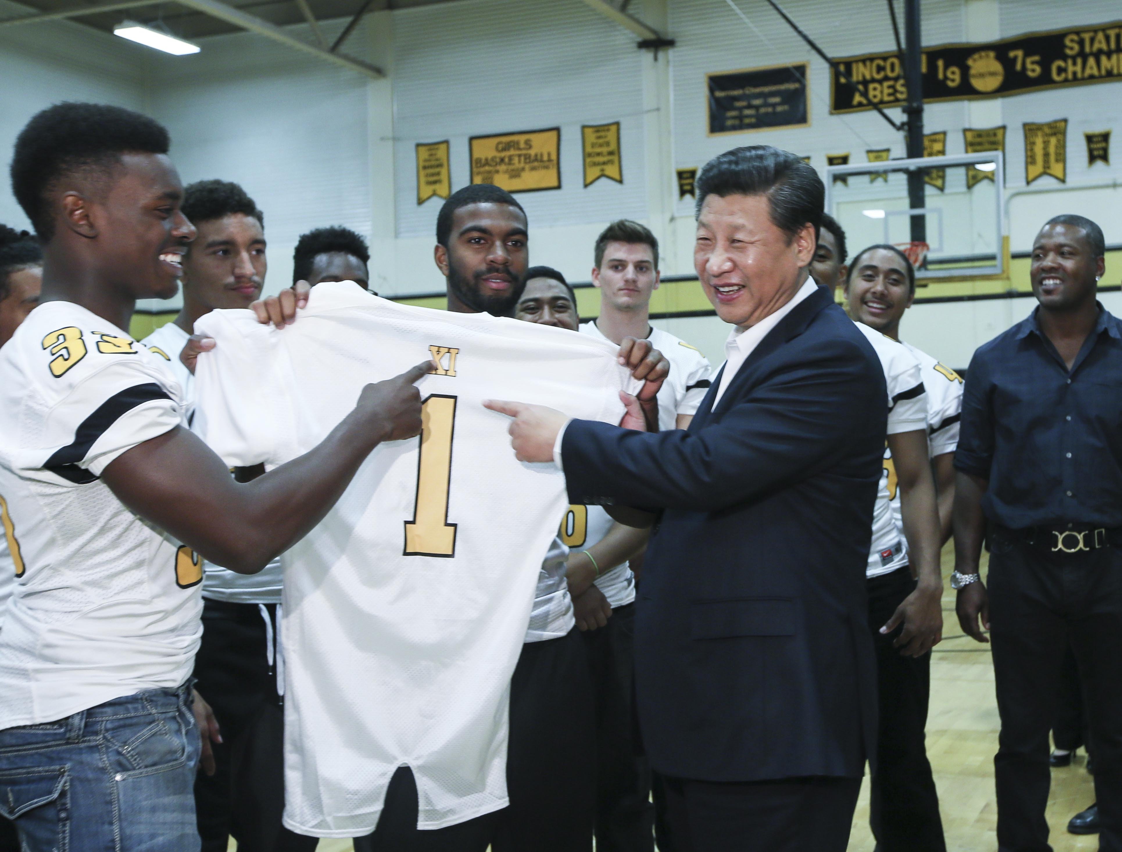 △ 2015年9月23日,國(guó)家主席習(xí)近平參觀美國(guó)塔科馬市林肯中學(xué)。這是習(xí)近平接受學(xué)生們贈(zèng)送的橄欖球衣。