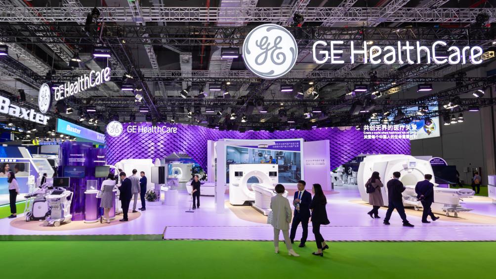 11月8日在第六屆進(jìn)博會醫(yī)療器械及醫(yī)藥保健展區(qū)拍攝的GE醫(yī)療展位。