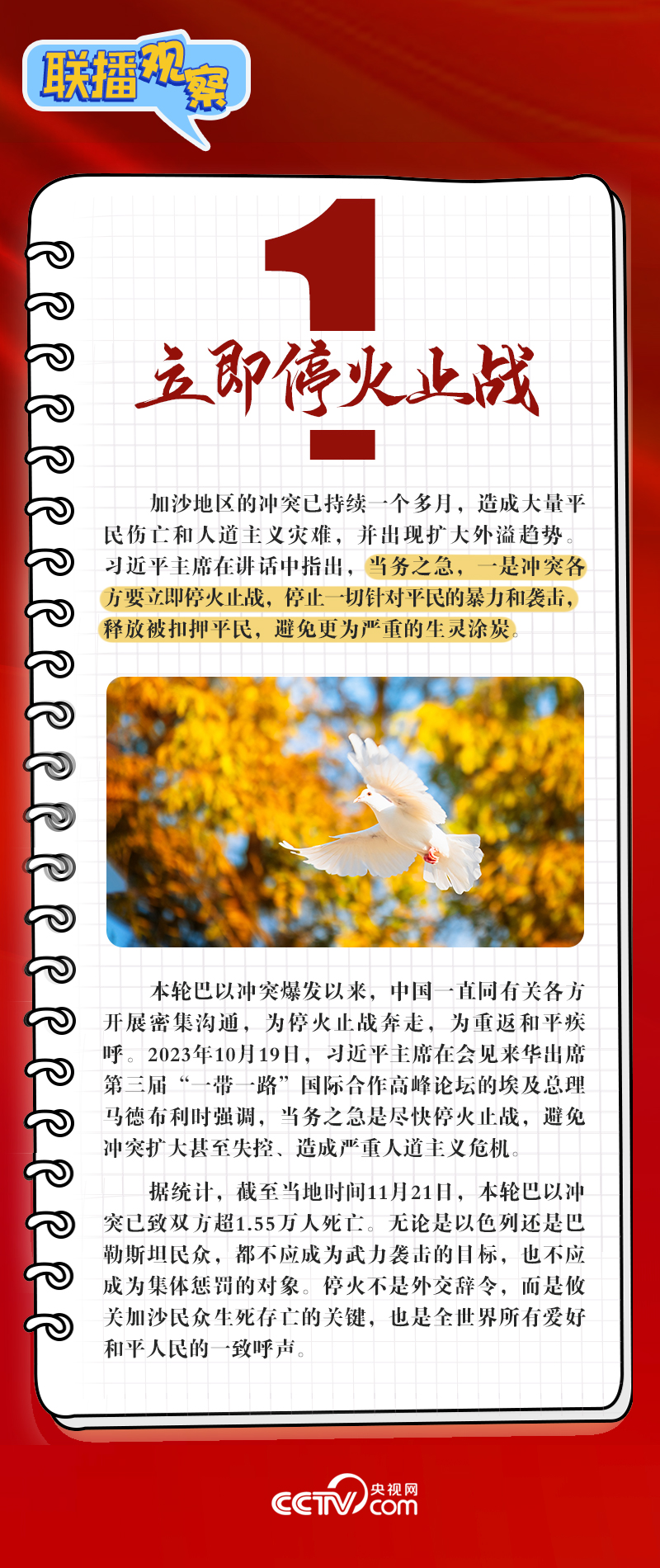11月21日晚,中國國家主席習(xí)近平出席金磚國家領(lǐng)導(dǎo)人巴以問題特別視頻峰會(huì)并發(fā)表重要講話,呼吁沖突各方立即?;鹬箲?zhàn)。中方呼吁盡快召開更具權(quán)威性的國際和會(huì),凝聚國際促和共識(shí),推動(dòng)巴勒斯坦問題早日得到全面、公正、持久解決。