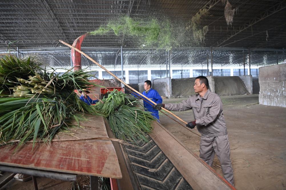 近日,在廣西來賓市一家養(yǎng)牛場(chǎng),工作人員正將甘蔗尾梢加工成飼料。 新華社記者 周華 攝