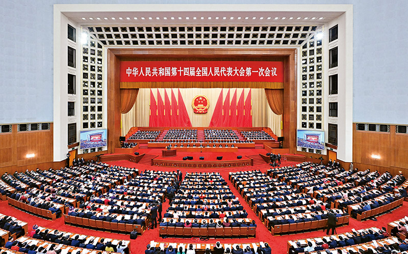 圖為2023年3月5日,第十四屆全國人民代表大會(huì)第一次會(huì)議在北京人民大會(huì)堂開幕。 新華社記者 翟健嵐/攝