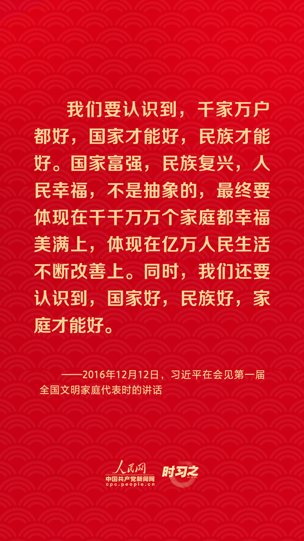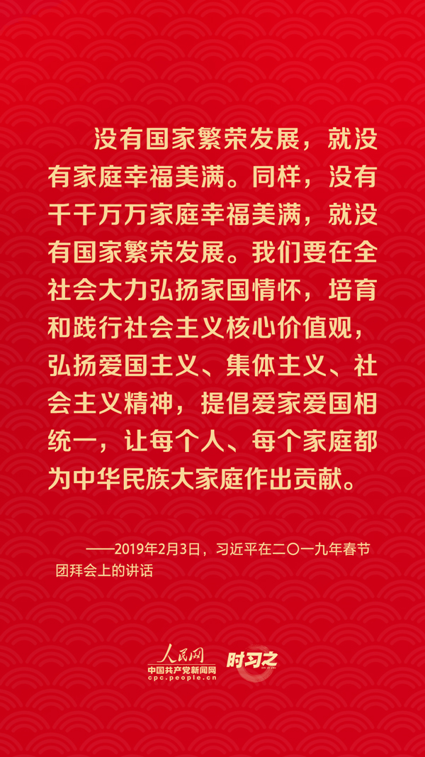團(tuán)圓是春節(jié)永恒的主題?!皼]有國家繁榮發(fā)展,就沒有家庭幸福美滿。同樣,沒有千千萬萬家庭幸福美滿,就沒有國家繁榮發(fā)展?!绷?xí)近平總書記曾在多個(gè)場(chǎng)合深刻闡述家庭與國家之間的關(guān)系,從他的話語里一起感悟深厚的家國情懷。