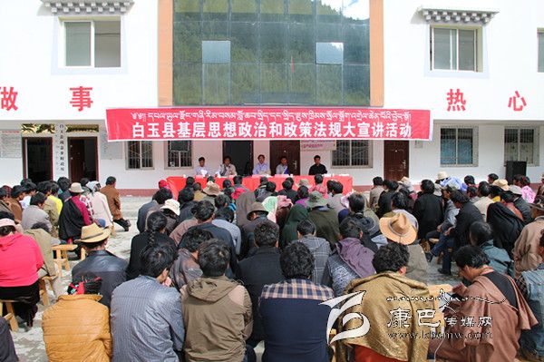 ?。冈碌陌子瘢胰债旑^,秋高氣爽。31日上午,絨蓋鄉(xiāng)政府大院內(nèi),白玉縣基層思想政治和政策法規(guī)大宣講活動正在這里精彩“上演”,400多名前來“聽課”的各村群眾正津津有味地品味著縣宣講團成員松吉尼瑪通俗易懂的藏語大宣講。從黨的十八大到十八屆三中全會精神,從糧食直補到低保、新農(nóng)保,從養(yǎng)老保險、殘疾人幫扶到相關法律法規(guī),宣講者深入淺出,傾聽者全神貫注。