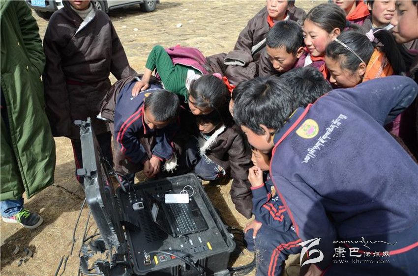 孩子們圍坐在國家電網四川電力公司前的便攜式衛(wèi)星通訊設備,與另一方連線的人進行視頻聊天。