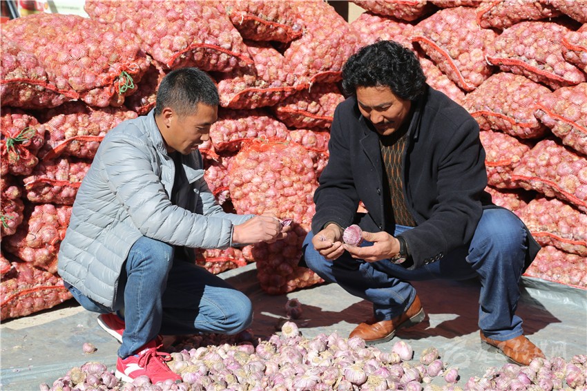 為保障村民的積極性和利益,八埡村積極協(xié)調(diào)村民們成立專業(yè)合作社,并與外地商戶簽訂收購(gòu)協(xié)議,合作社負(fù)責(zé)從農(nóng)戶收購(gòu)大蒜運(yùn)往協(xié)議收購(gòu)商家。種植戶擁珍志瑪看著自己收獲的大蒜說:“今年我家種了2畝多,合作社直接到地頭收購(gòu),這讓我們省了不少心”。