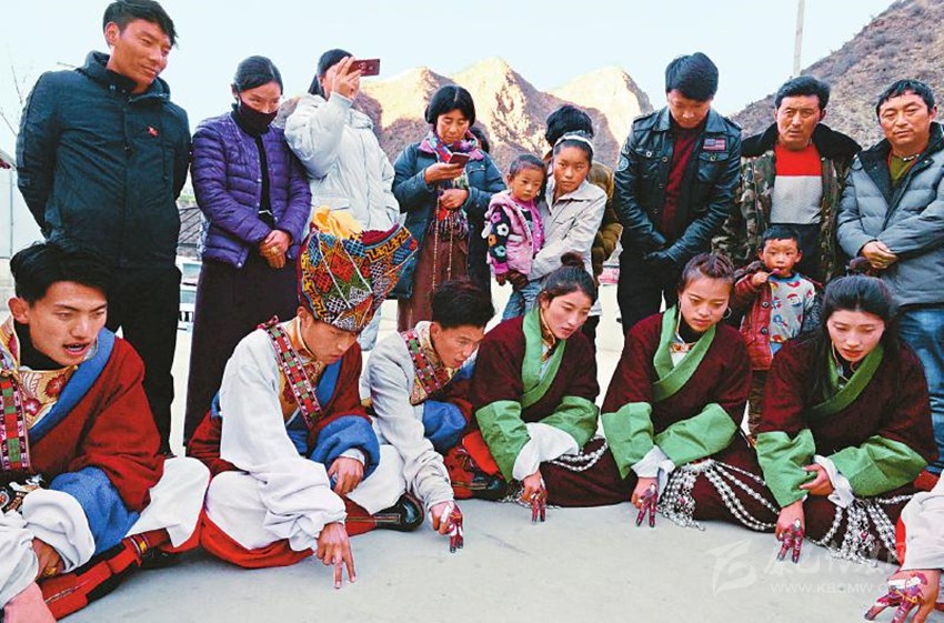 2017年12月22日,白玉縣城陽光普照,縣藝術團一群“90后”藏族演員用顏料相互在食指和中指上熟練地繪制著具有當?shù)孛袼滋厣娜宋飯D案。音樂響起,演員們的手指隨著節(jié)拍翩翩起舞,左挪右轉。隨著唱詞和曲調(diào)的變化,手指的動作幅度和節(jié)奏也隨之變化。藝人的情感起伏、喜怒哀樂被“小人”般的手指表現(xiàn)得淋漓盡致。