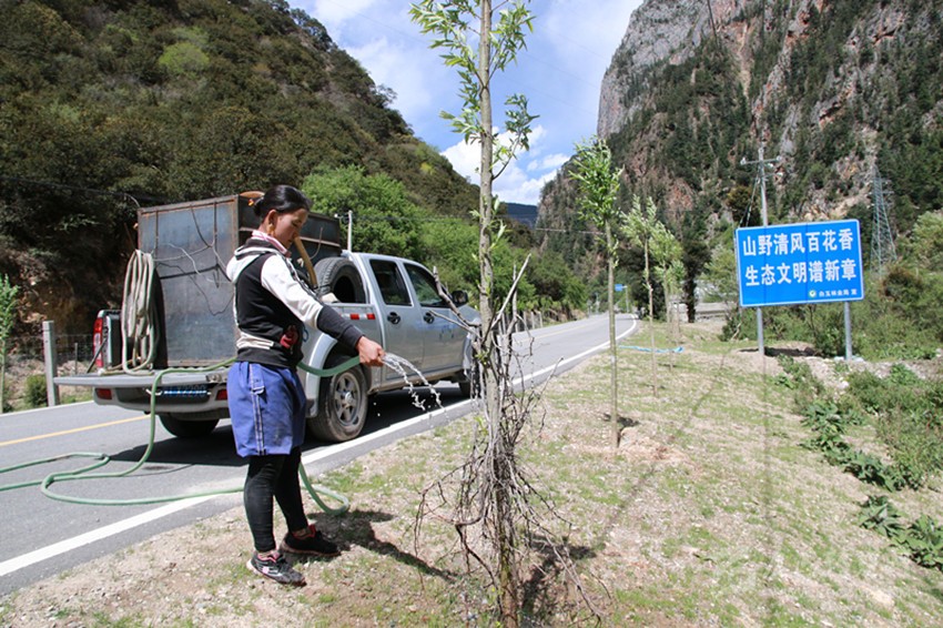 植樹容易,保持存活率很難。“植樹植樹,一分栽九分管。我們植樹造林不只看數(shù)量,更注重質(zhì)量,注重栽植方法和科學(xué)的后期養(yǎng)護(hù)管理,保證樹木的成活率。”6月11日,在白玉縣絨蓋鄉(xiāng),長(zhǎng)江造林局駐白玉管護(hù)站站長(zhǎng)梁榮忙著進(jìn)行現(xiàn)場(chǎng)管護(hù)技術(shù)指導(dǎo),“把遮陽網(wǎng)裹緊點(diǎn)、把刺巴綁緊點(diǎn),以免牛和馬啃皮子;水要澆透,不然水分不夠,樹子一斷水,再想‘返陽’就難了;護(hù)欄水泥樁要栽牢,不然牛馬一撞就倒了……”。