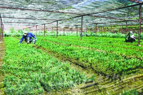 白玉林業(yè)局職工查看俄色樹(shù)苗生長(zhǎng)情況。