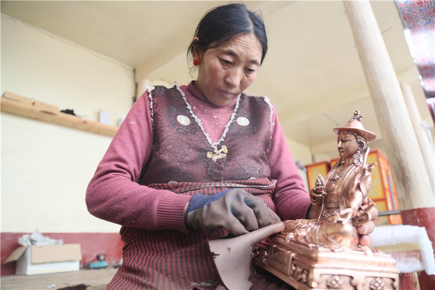 手工藝者布姆正在打磨銅鑄佛像??渴止ぜ妓嚕寄酚兄€(wěn)定收入,于去年實(shí)現(xiàn)了脫貧。