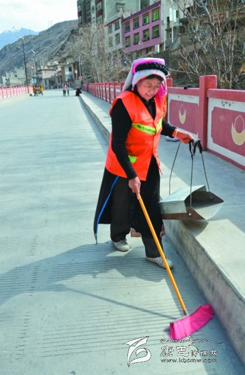 由于丹巴縣城素有風(fēng)城之稱,五條山谷的風(fēng)仿佛都聚集在了志瑪大姐負(fù)責(zé)的濱河路上,風(fēng)的匯聚也成了垃圾的集中點(diǎn),當(dāng)時(shí)在分配工區(qū)時(shí),許多清潔工都唯恐這段路落在自己頭上,可志瑪大姐卻主動(dòng)承擔(dān)起這段路面的清潔任務(wù),每天其他清潔工人還在睡夢(mèng)中時(shí),她就早早的起床,開始一天的工作。烈日當(dāng)空時(shí),別人都躲在家里乘涼時(shí),志瑪大姐還在路段上來(lái)回的巡視,時(shí)刻保持路面的清潔。冬日來(lái)臨寒風(fēng)呼嘯,城市里的人們都蜷縮在蝸居里開著空調(diào)、電暖氣等,享受著天倫之樂(lè)時(shí),志瑪大姐卻穿著厚厚的冬裝,戴著手套在濱河路上費(fèi)力的掃著地,她從來(lái)沒(méi)有叫過(guò)一聲苦,有人勸她放棄這段路,她總是笑著說(shuō):“國(guó)家給了我工資,我就要好好的干,再說(shuō)城市如果沒(méi)有我們這些清潔工,那市民將會(huì)生活在臟亂差的環(huán)境里,將有損丹巴這座美麗小城鎮(zhèn)的形象。”