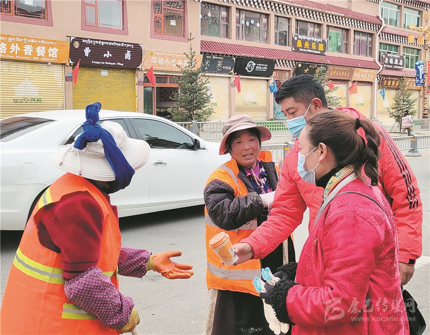 理塘青年志愿者為環(huán)衛(wèi)工人送奶茶和手套