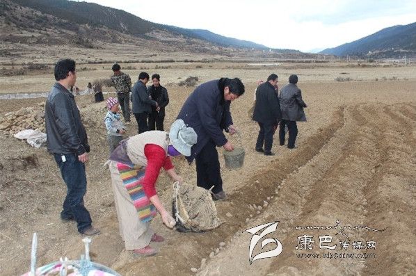 在格中村的田間地頭,到處是一片忙碌的春播景象。雷建平走進(jìn)斯朗卓瑪?shù)奶镩g,在農(nóng)業(yè)技術(shù)人員的指導(dǎo)下,從選種開始學(xué)起,病害的種丟掉、大的切成幾瓣,撒點(diǎn)底肥,均勻丟種,把蓋種的土弄成一個梯形的壟。雷建平一邊勞動,一邊和斯朗卓瑪攀談,去年土豆收成怎樣?有沒有增加收入?今年春耕生產(chǎn)有哪些實(shí)際困難?雷建平又接著向她推薦用地膜種土豆的好處,蓋不蓋膜大不一樣,1畝要多收500-1000公斤,加上上市早,價格也要貴一些,可以到臨近的甲洼鄉(xiāng)江達(dá)村去學(xué)習(xí)經(jīng)驗(yàn)。