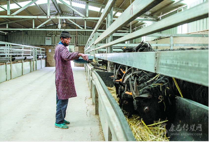 1月28日,白玉黑山羊燈龍保種繁育基地,村民向巴志瑪正在飼養(yǎng)黑山羊。養(yǎng)羊有工資、種草有收入,向巴志瑪說自己是發(fā)了“羊財”。
